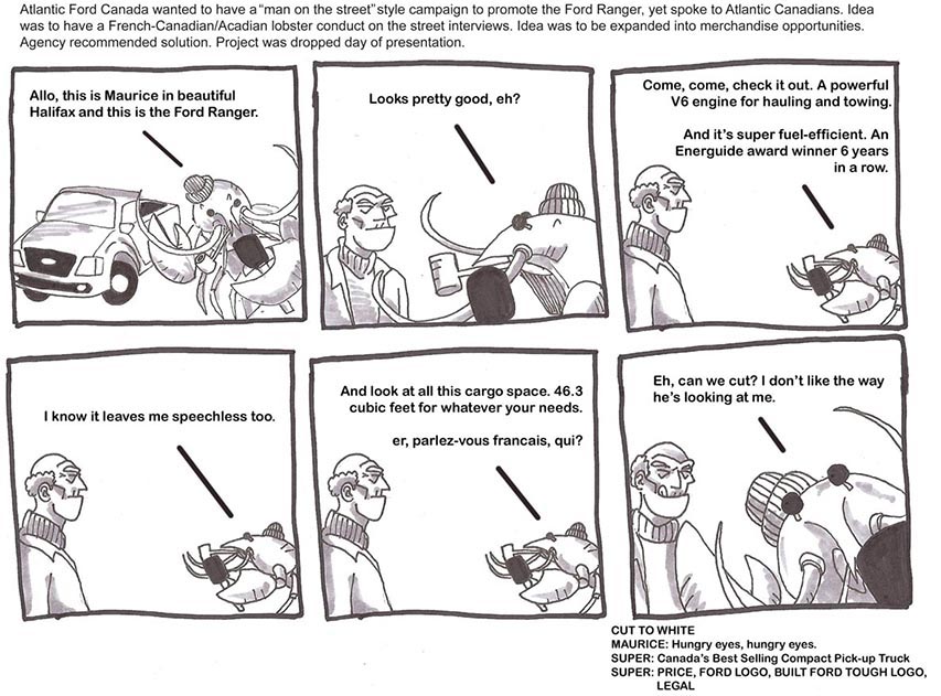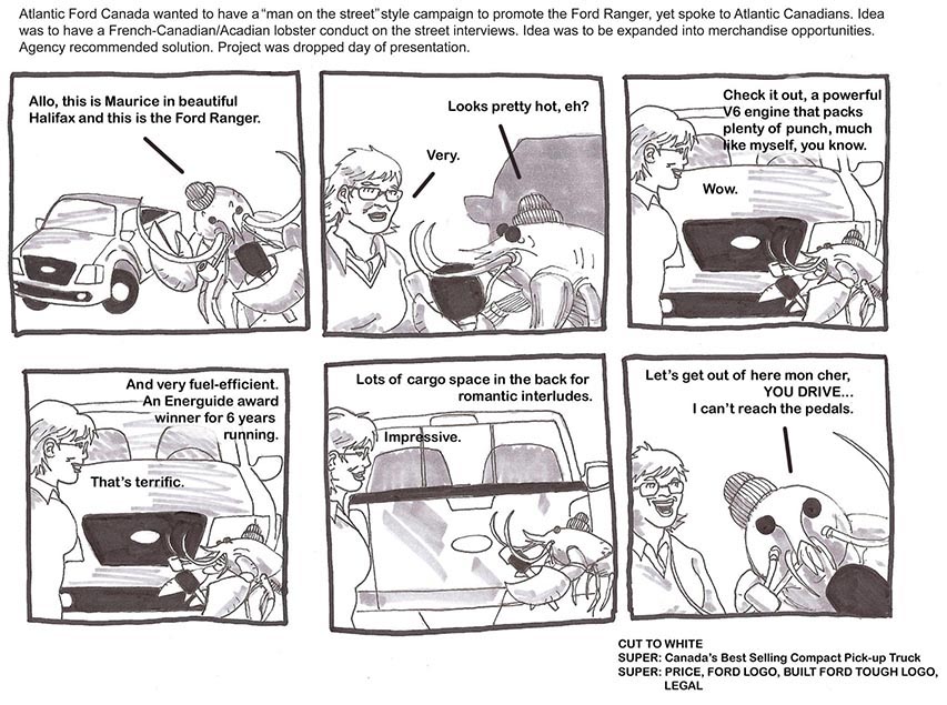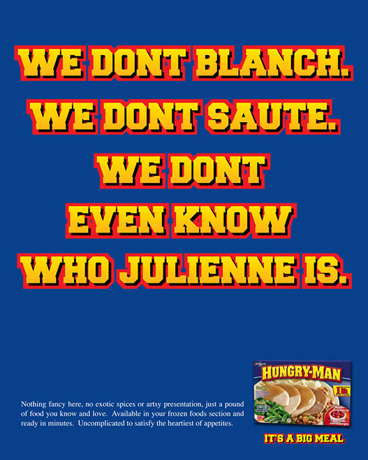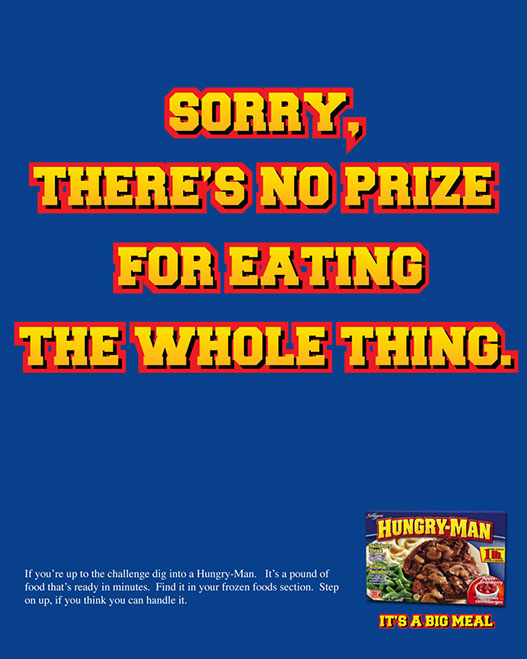 This advertising challenge was for Swanson’s Hungry-Man frozen dinners while I was attending school. It was awarded a merit at that year’s Advertising & Design Club of Canada award show. I developed the concept, copy and design.