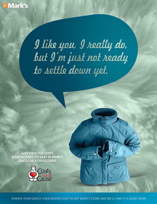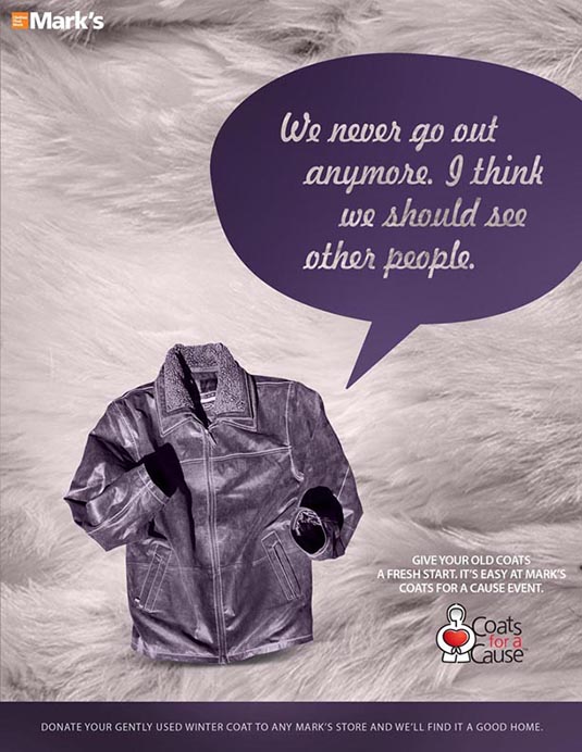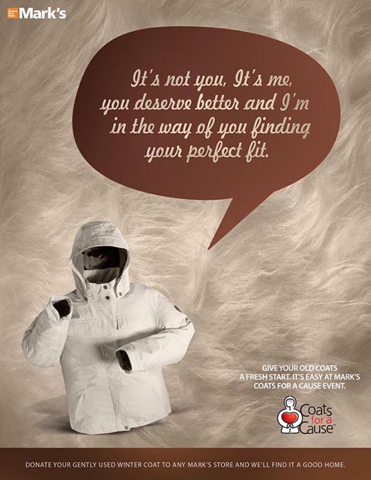 Breaking up is never easy. But a little easier when it's for a good cause. This charitable event provided pre-loved winter coats to those in need. I collaborated with an art director on the concept and provided the copy.