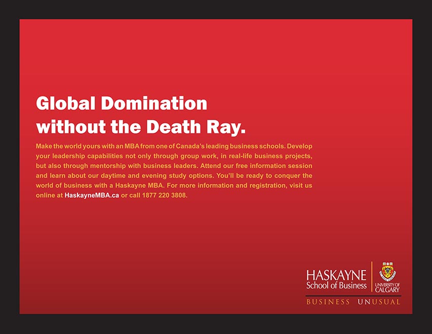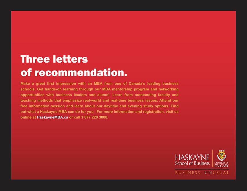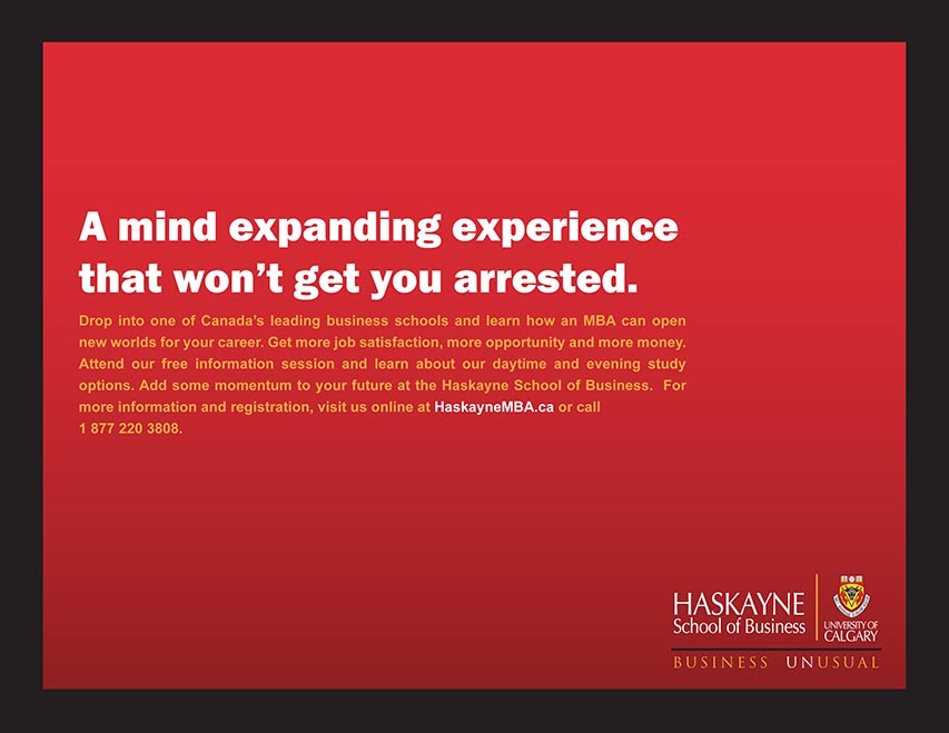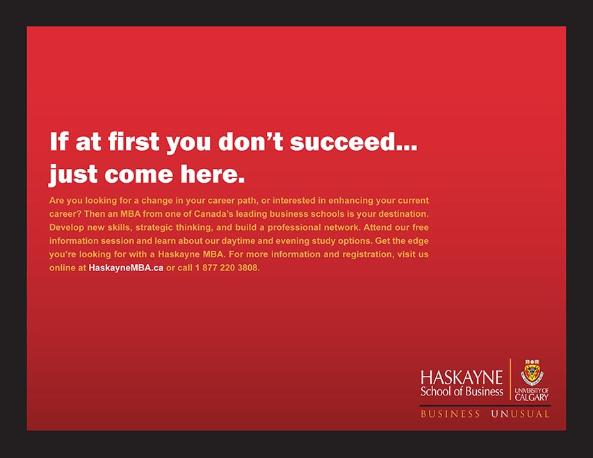 The Haskayne School of Business was looking to promote their MBA program through a print campaign. I developed the concept, copy and design.