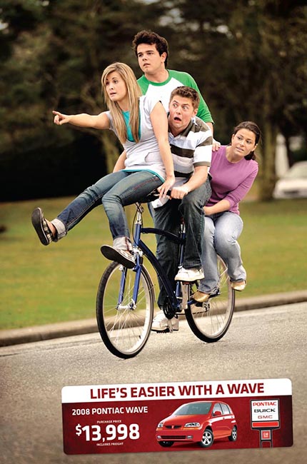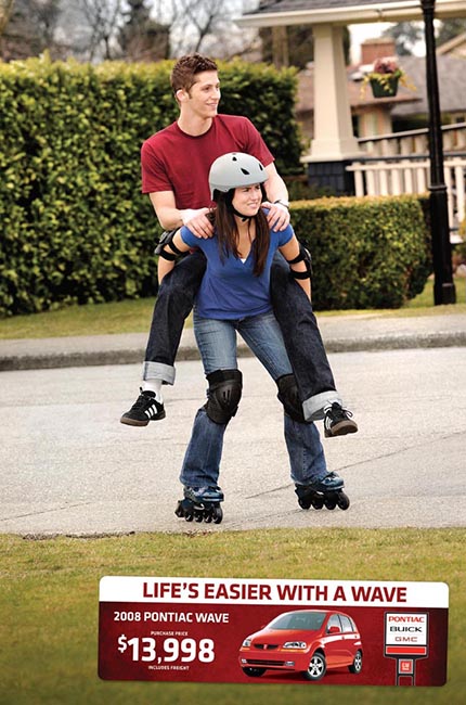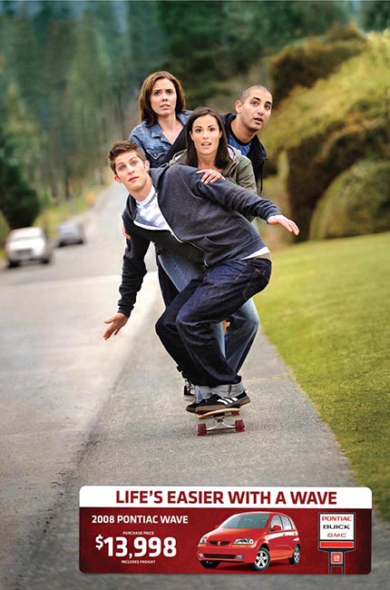 GM wanted a print campaign targeting university students to promote the affordable Pontiac Wave. These ads were placed at all Alberta universities. I collaborated with an art director on the concept and provided the copy.
