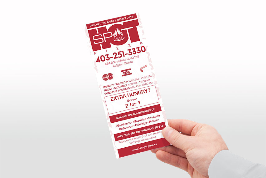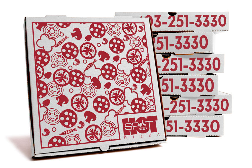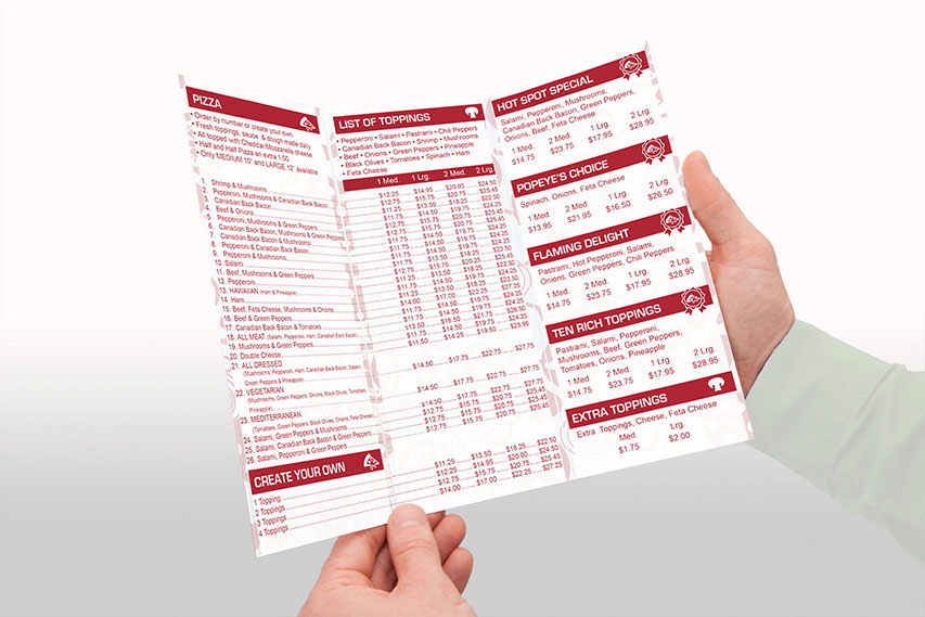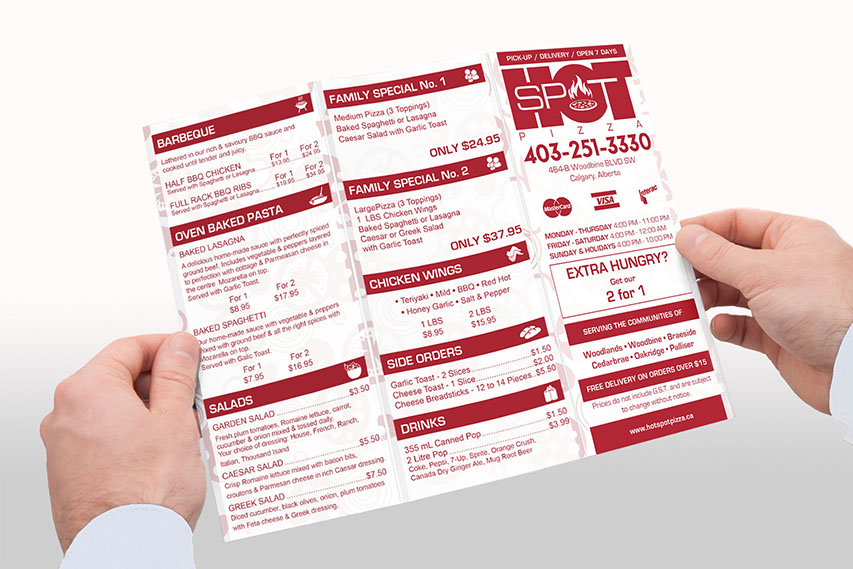 My mother-in-law once owned and sold a pizzeria. I resurrected it with a brand new look that I designed. I designed it with a limited budget in mind, so I created everything in one colour but that would also work in black and white.