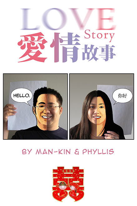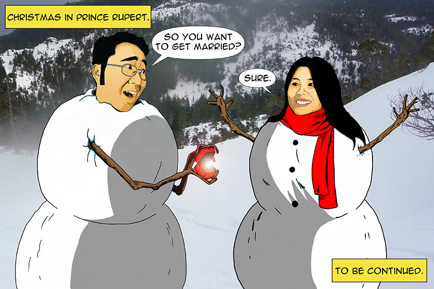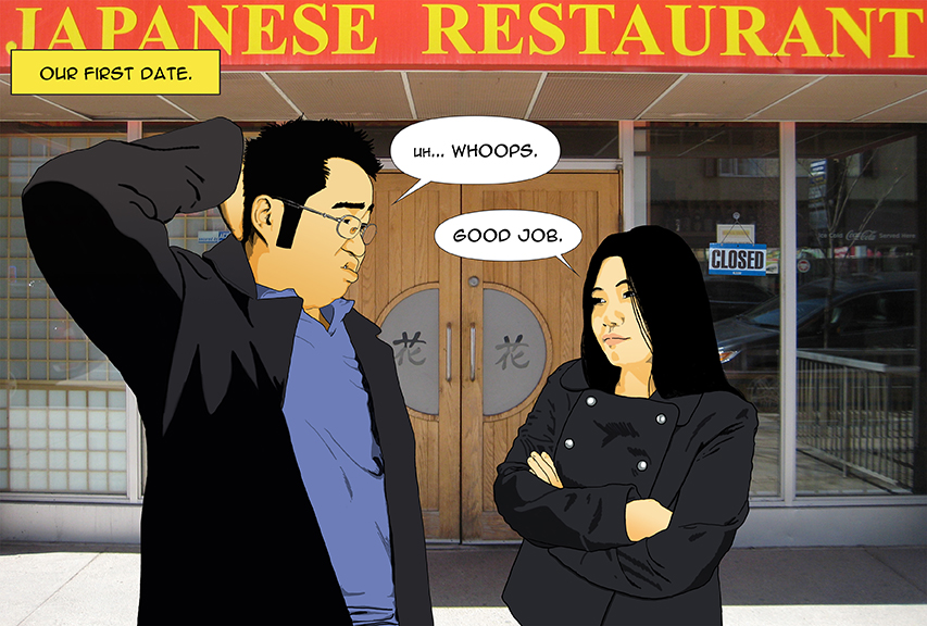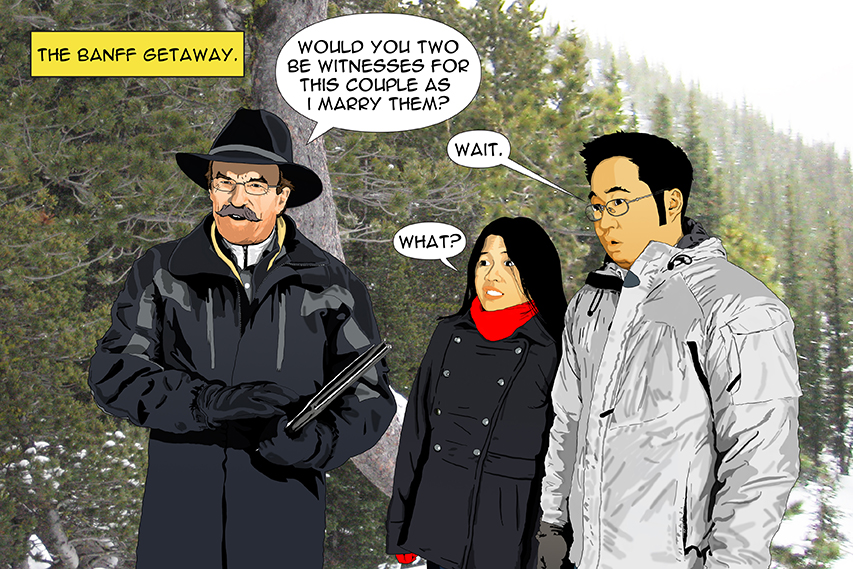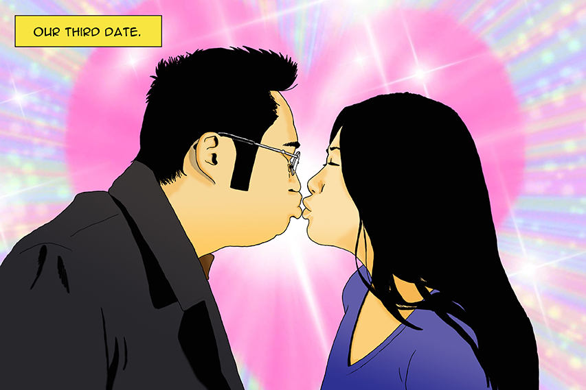 I created a series of illustrations to greet our wedding guests arriving at the ceremony and reception, retelling pivotal moments of our courtship.