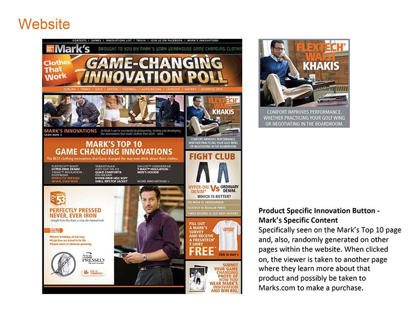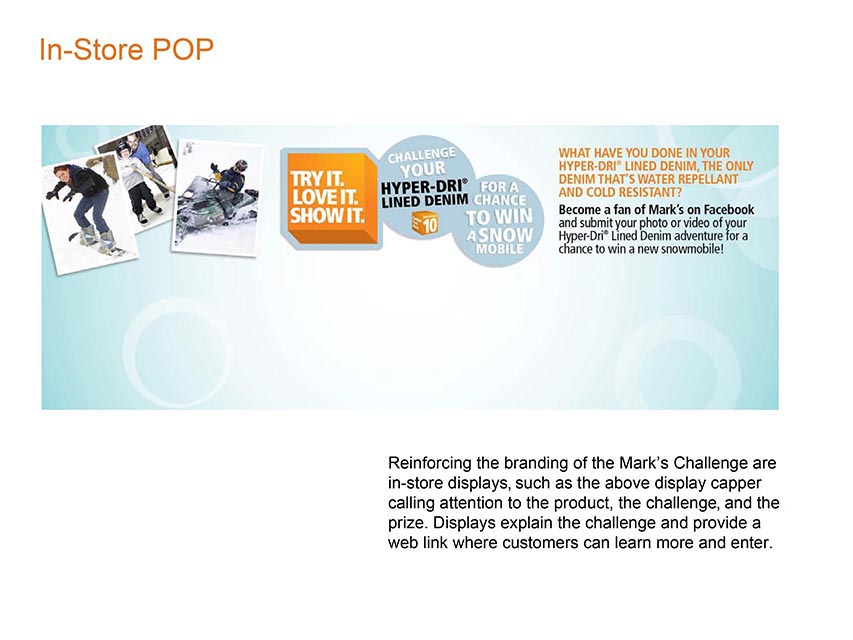 This campaign deck for Mark’s goes through all the elements for this campaign with Facebook being the main tool to enter and win in this contest. An art director and myself provided concept and copy for all elements as well as the Facebook page.